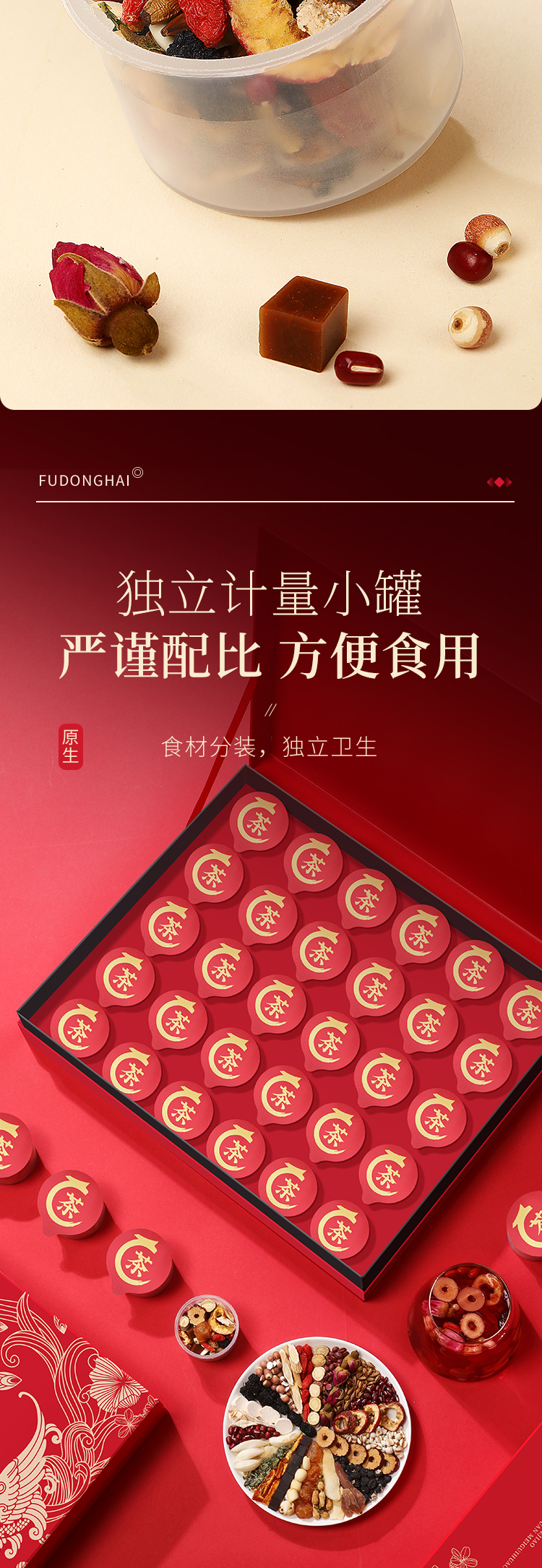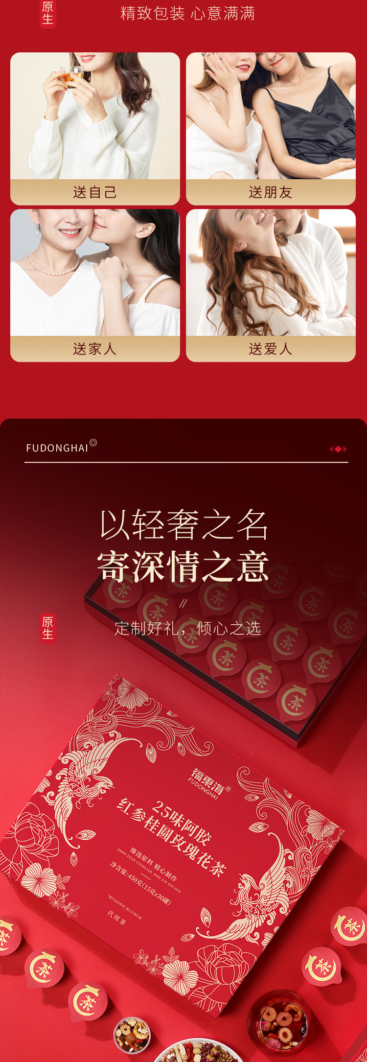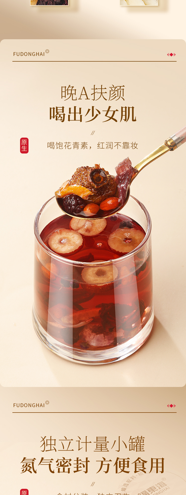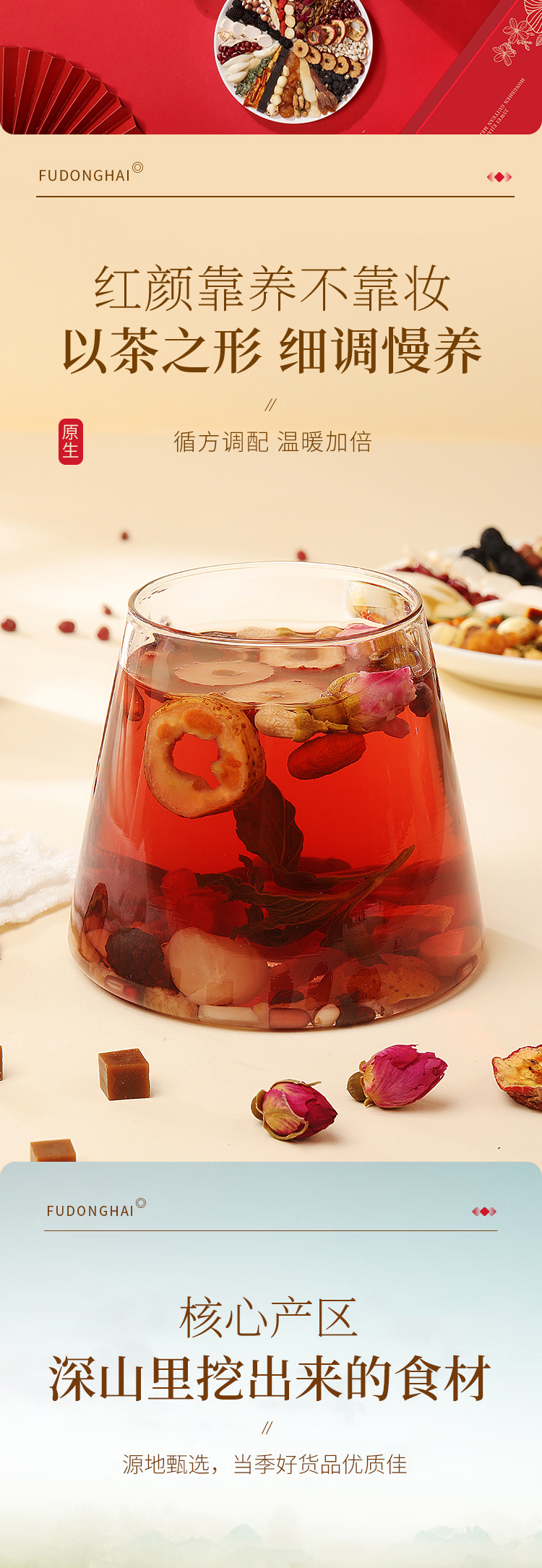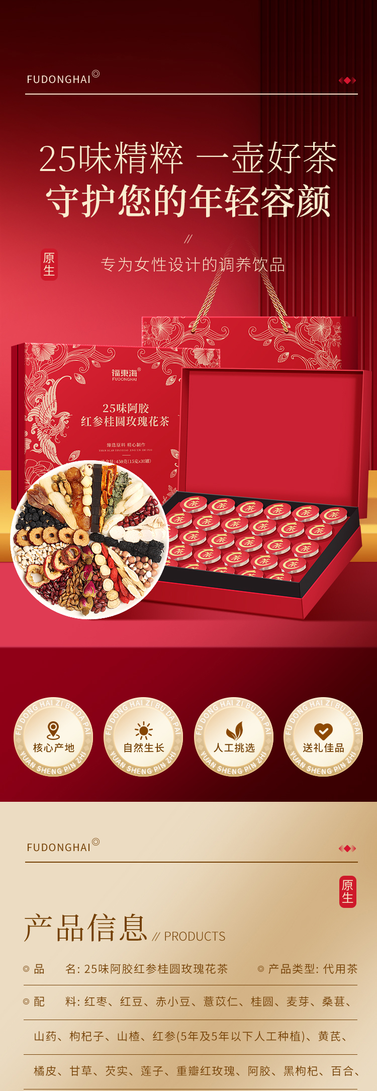 红颜靠养不靠妆,以茶之形,细调慢养。25味阿胶红参桂圆玫瑰花茶严控配比,以二十五种食材相辅相成,独立计量小罐,方便食用。