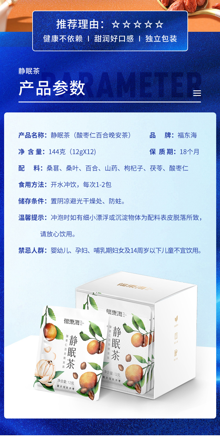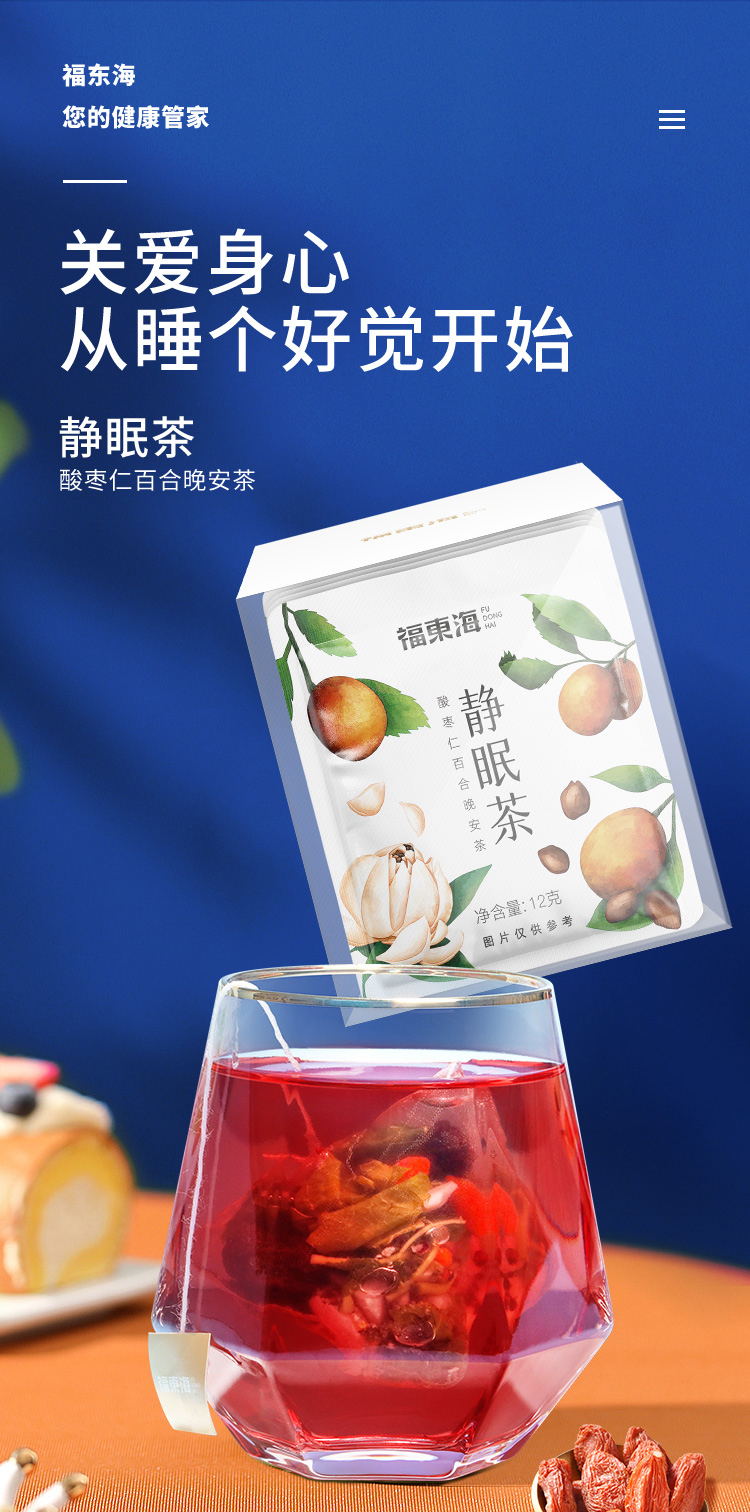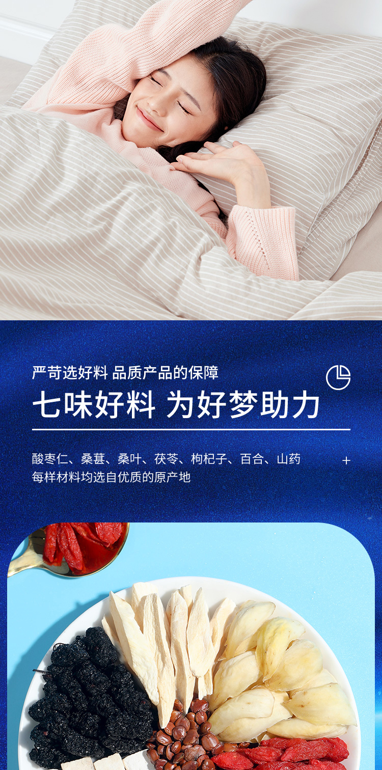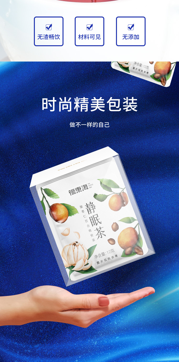 福东海汲取睡眠古方精髓,结合失眠人群的特点,加以改进升级、组方配比而成,严苛精选七味好料,为好梦助力。