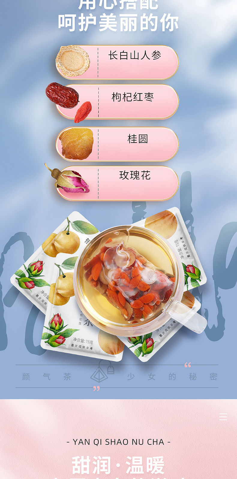 长白山人参+枸杞红枣+桂圆+玫瑰花,冲泡开来,茶汤澄黄透亮,玫瑰的花香,融入人参的药草香气,入口甘爽。