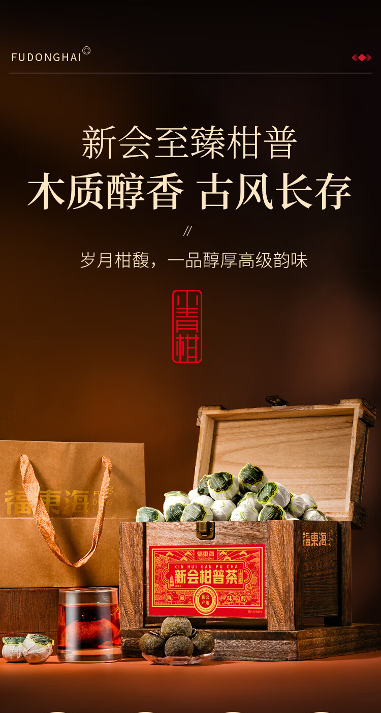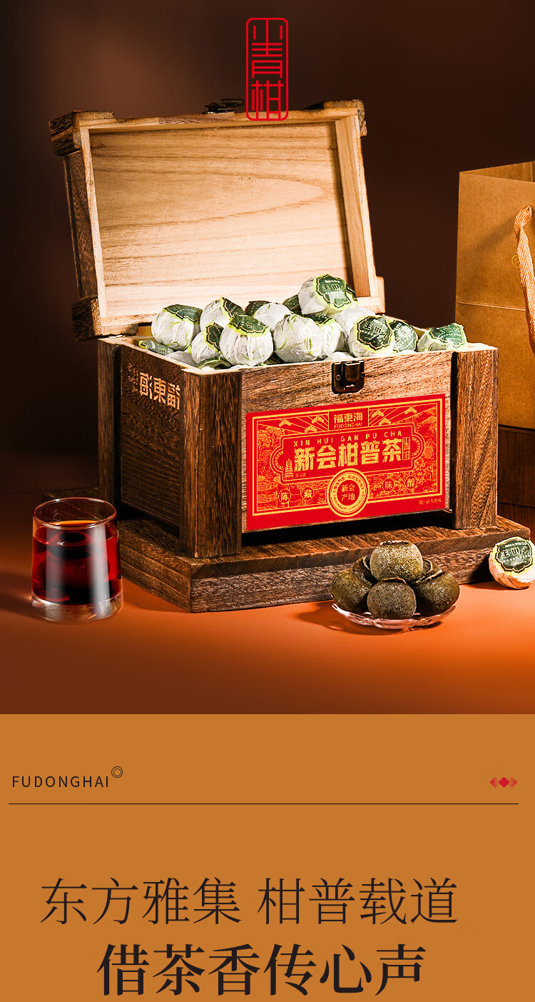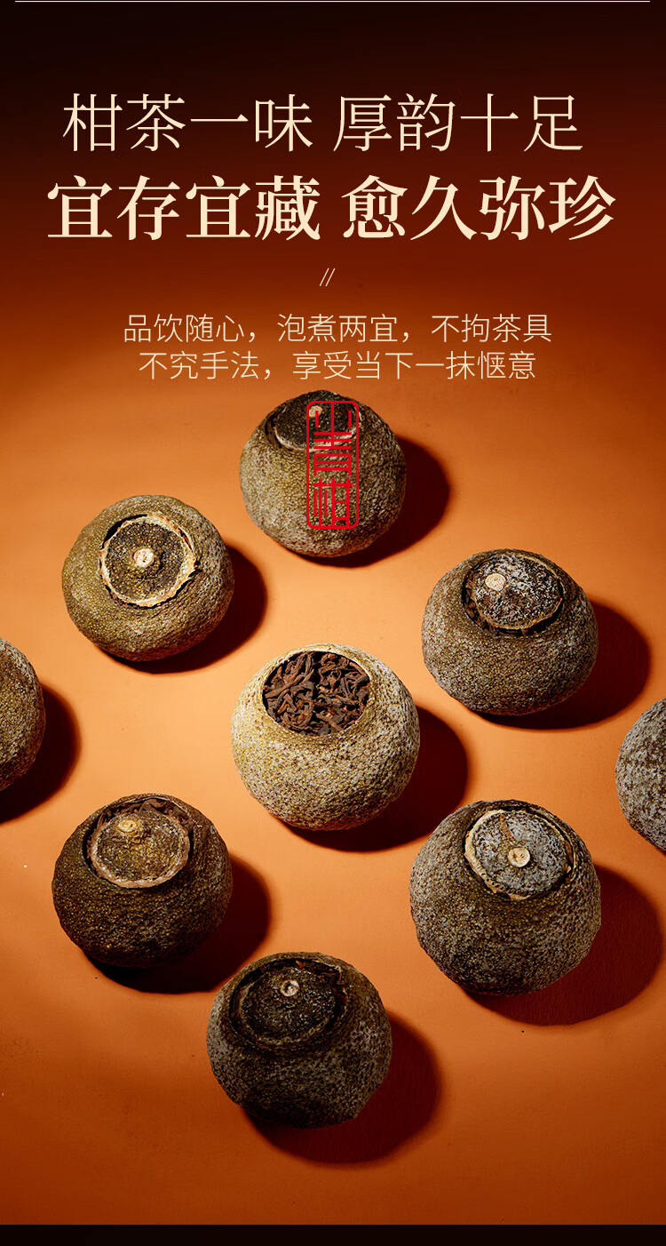 贵族柑礼,古典木箱,镌刻永恒的高雅品味。自带年份的柑果皮搭配宫廷熟普洱,醇和温润,木香萦绕,茶之鲜灵层层递进。
