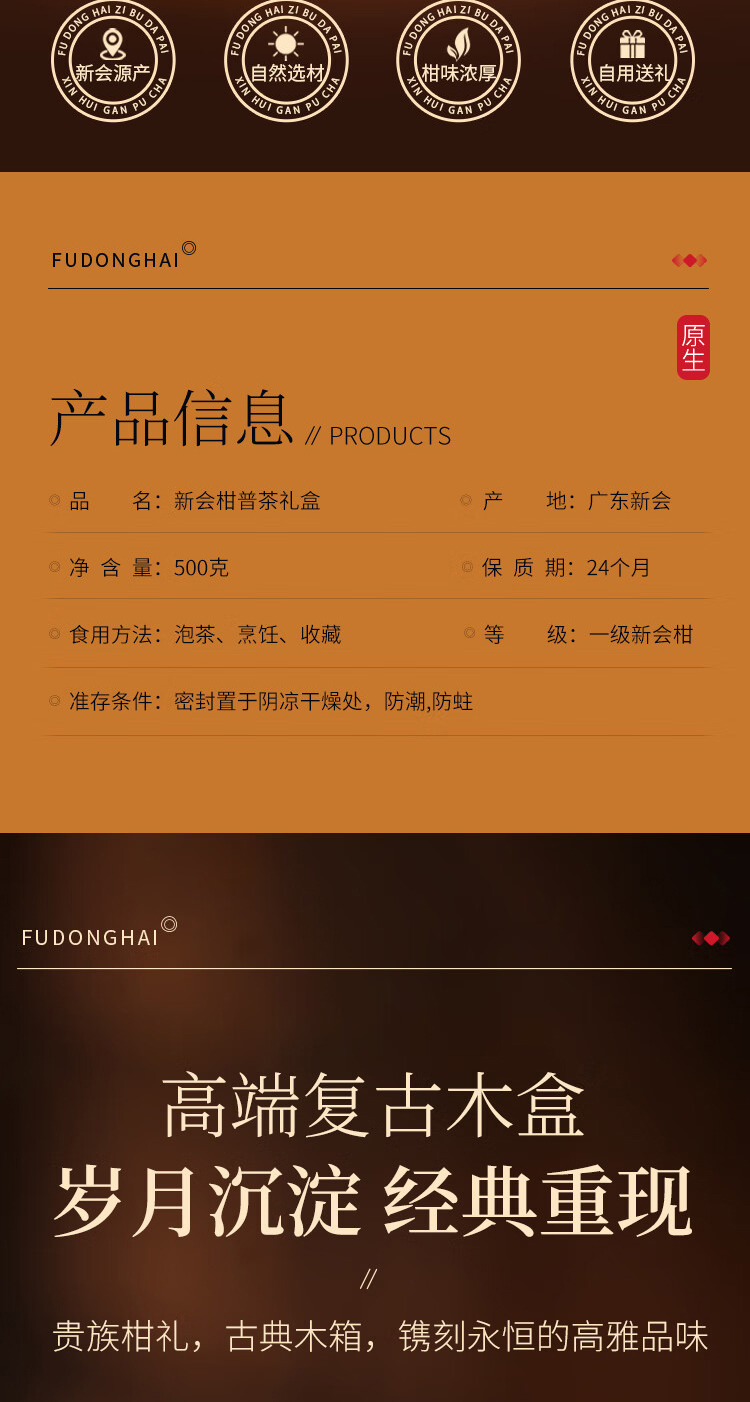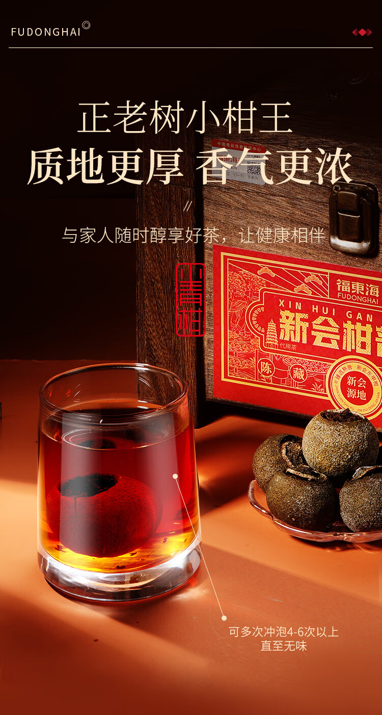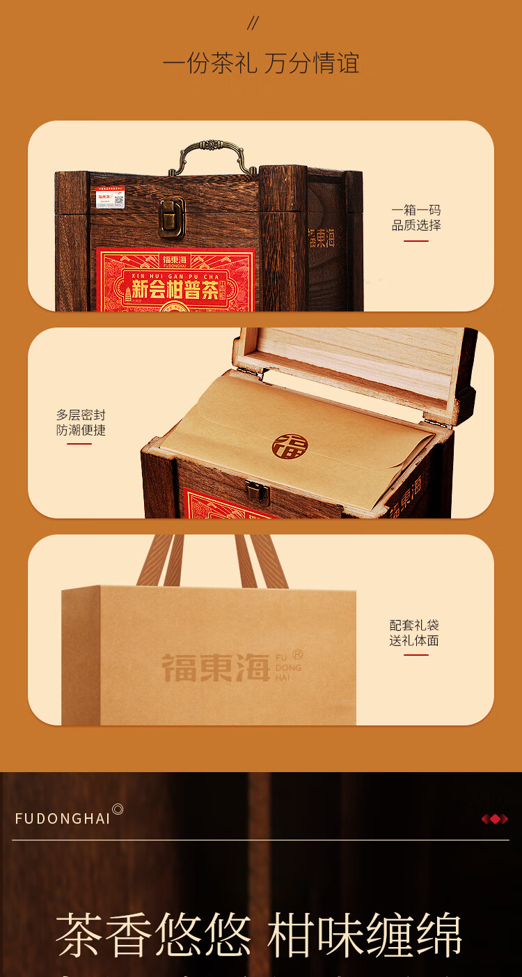贵族柑礼,古典木箱,镌刻永恒的高雅品味。自带年份的柑果皮搭配宫廷熟普洱,醇和温润,木香萦绕,茶之鲜灵层层递进。