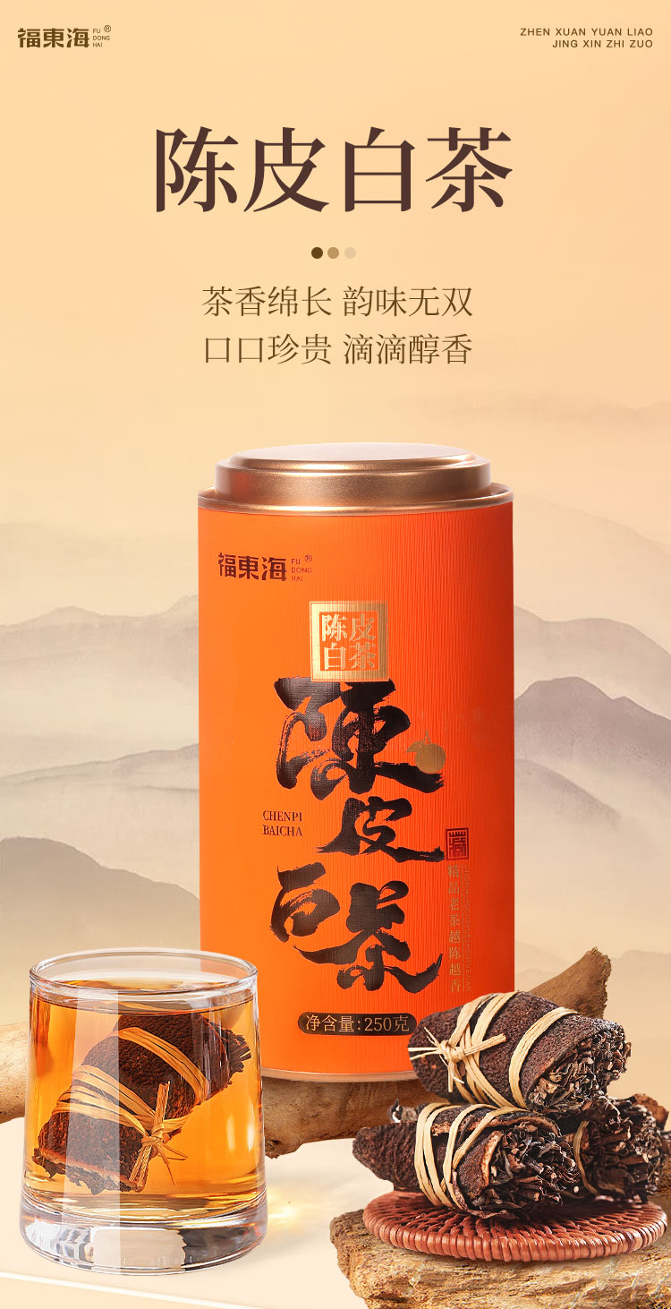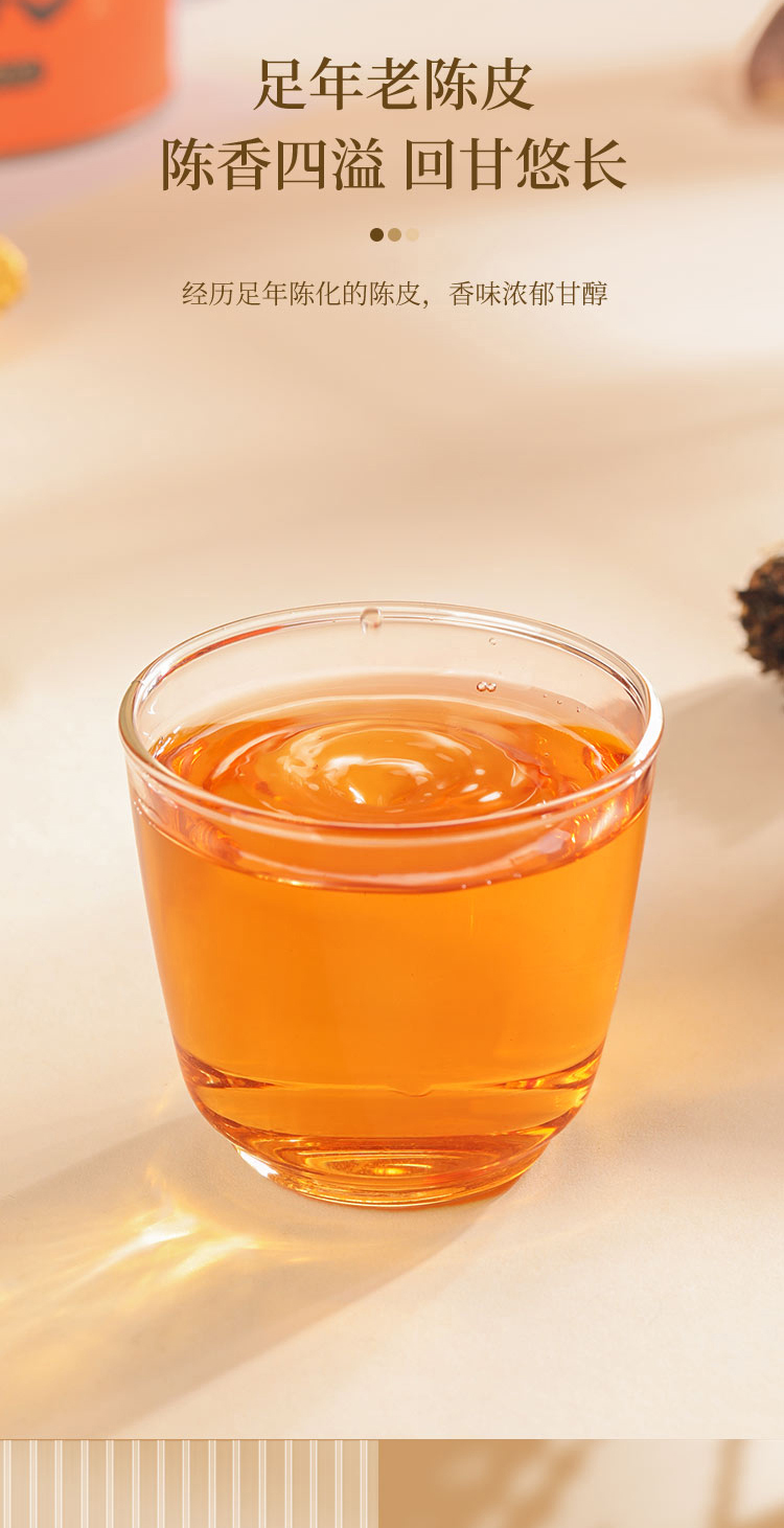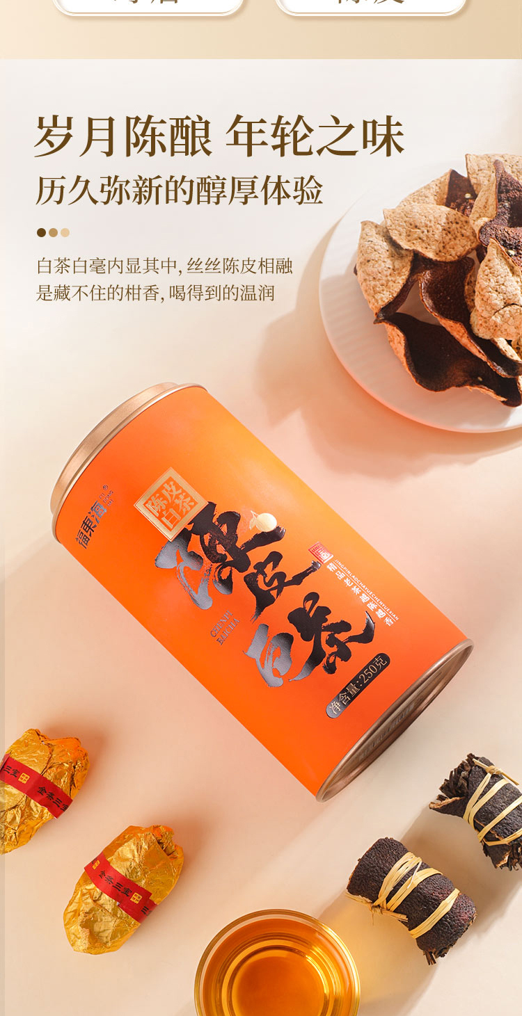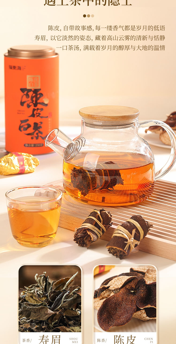 寿眉老白茶+足年老陈皮,茶香陈醇柑香内敛,茶汤绵柔包裹清雅甘香,品饮随心,泡煮两宜。