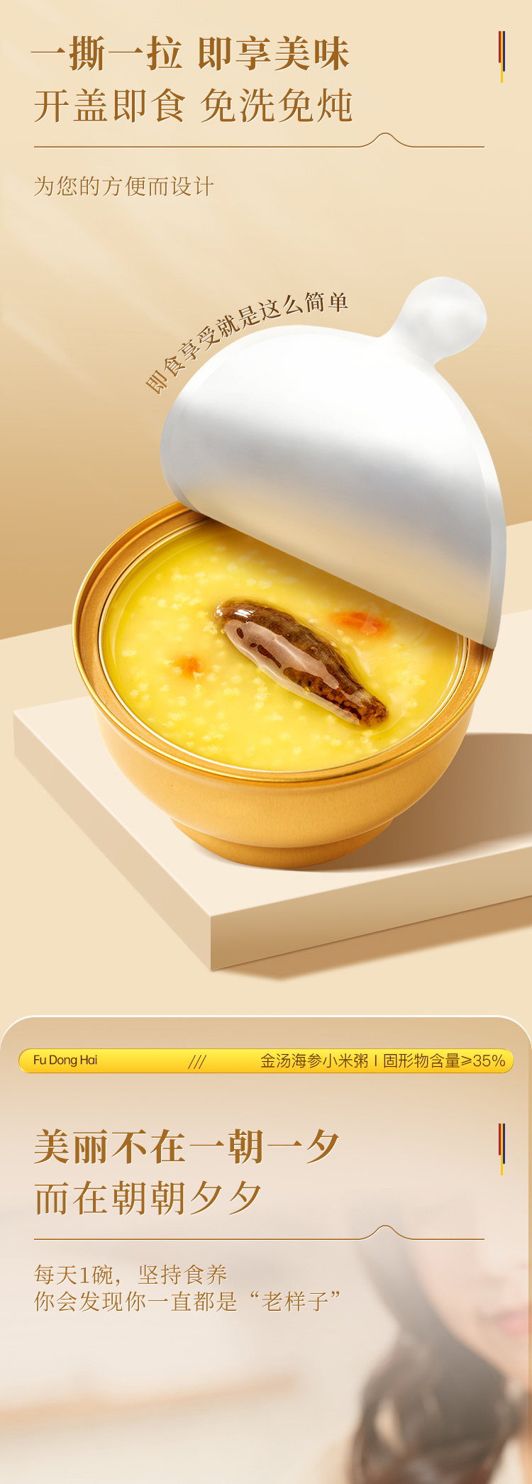 优质原料是一碗好粥的重要保证,用老母鸡熬满12小时制作高汤,加入深海优质海参、色泽金黄的小米,采用高端精炖工艺,释放食材自然鲜香,开盖即食,即享美味。
