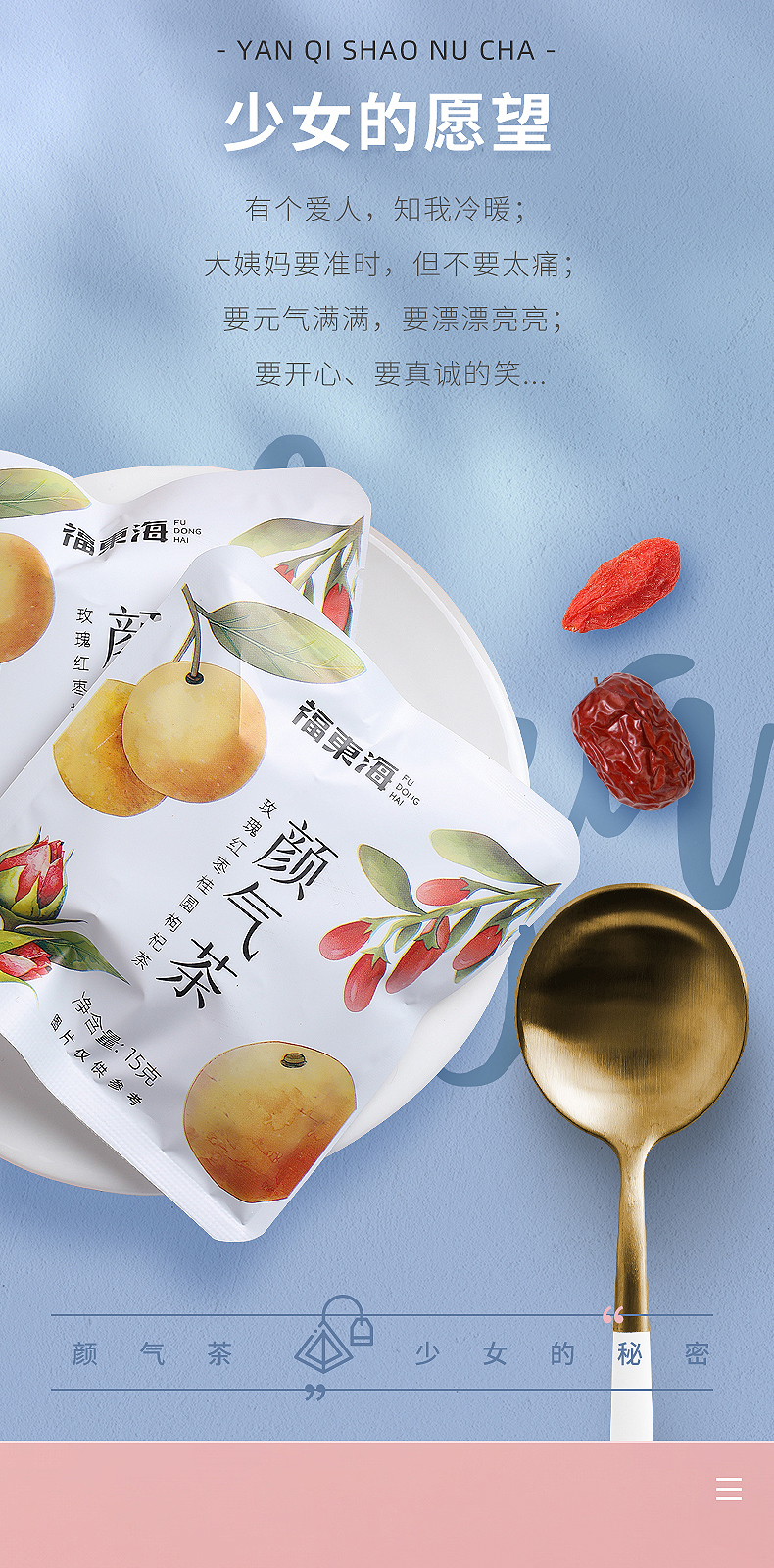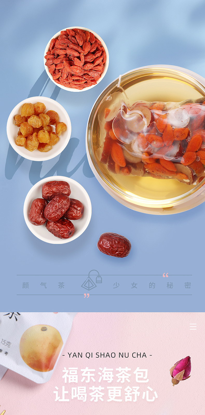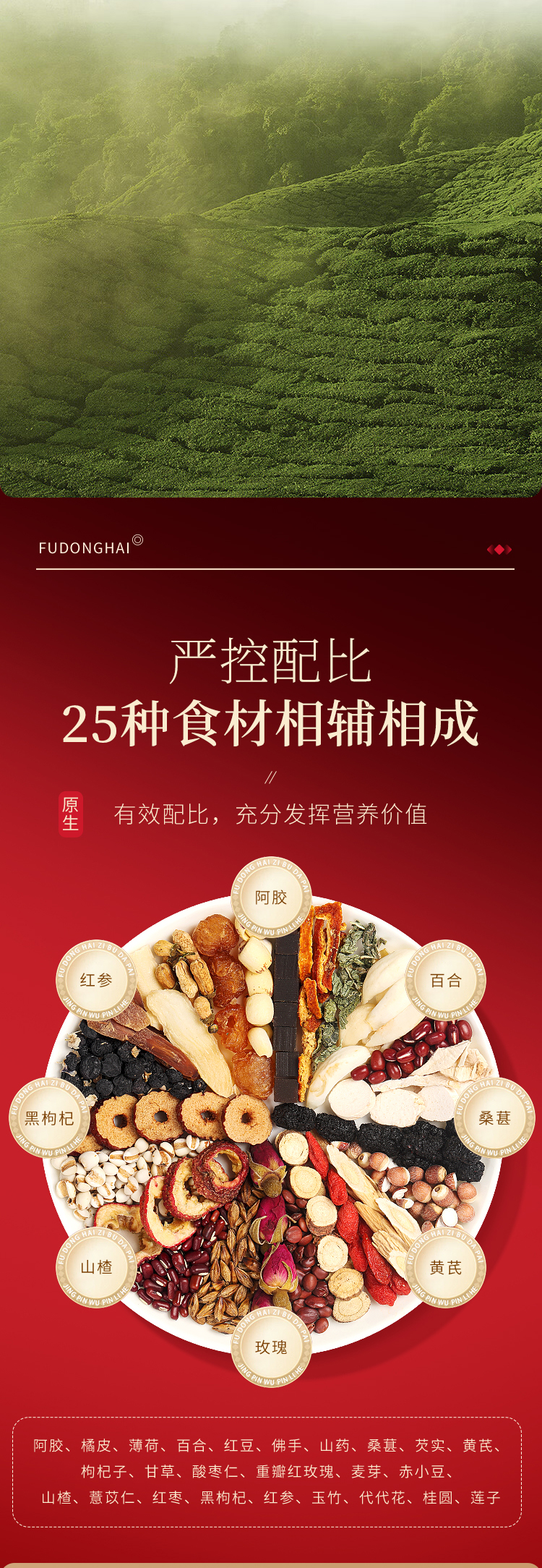红颜靠养不靠妆,以茶之形,细调慢养。25味阿胶红参桂圆玫瑰花茶严控配比,以二十五种食材相辅相成,独立计量小罐,方便食用。
