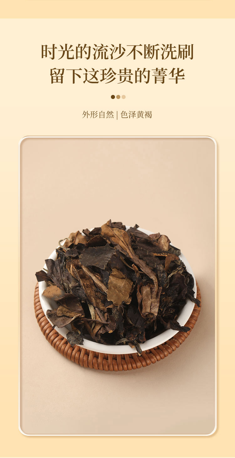寿眉老白茶+足年老陈皮,茶香陈醇柑香内敛,茶汤绵柔包裹清雅甘香,品饮随心,泡煮两宜。